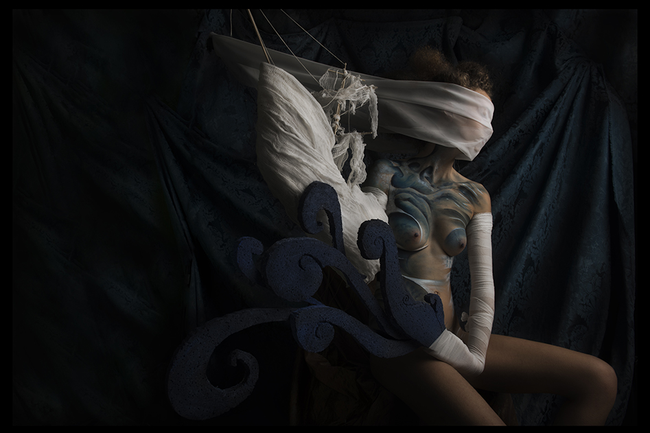 His body is a sea storm, with waves represented by various shades of blue. In one hand, he holds the uncontrollable power of the sea, represented by the waves, and in the other hand, he holds a shipwreck. In this picture, the figure is a personification of an imaginary legend, reminiscent of the Search for the Argonauts. Their body is a sea storm, with waves represented by various shades of blue. The veil covering her face recalls the unknown fate that awaits heroes.